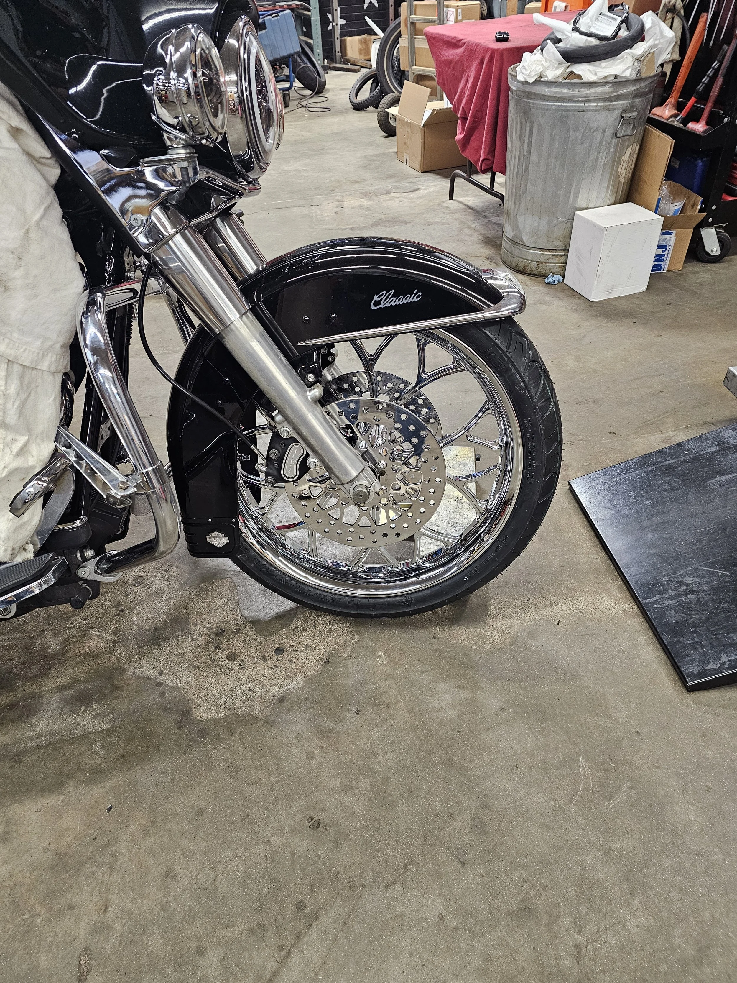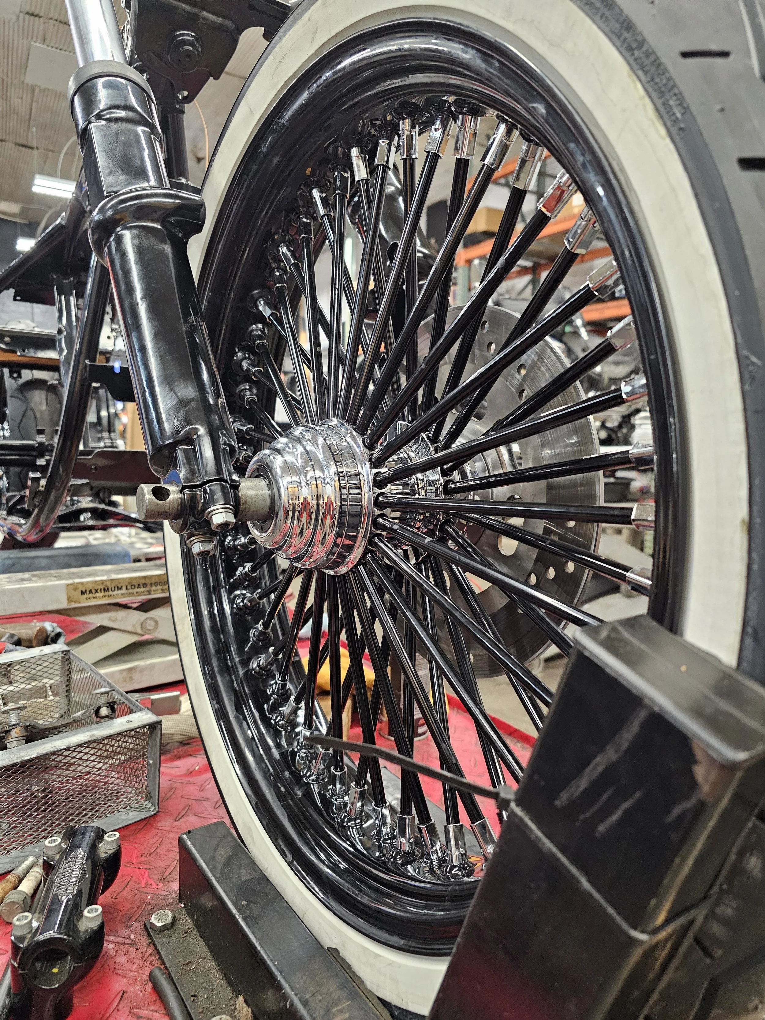 If you’re looking for a new OEM replacement or a total customized rim, we can help find what you need and properly install it, making sure that bearings are meticulously spaced correctly. Black spokes, chrome spokes, fat spokes, alloy wheels, whatever you prefer, we can help.